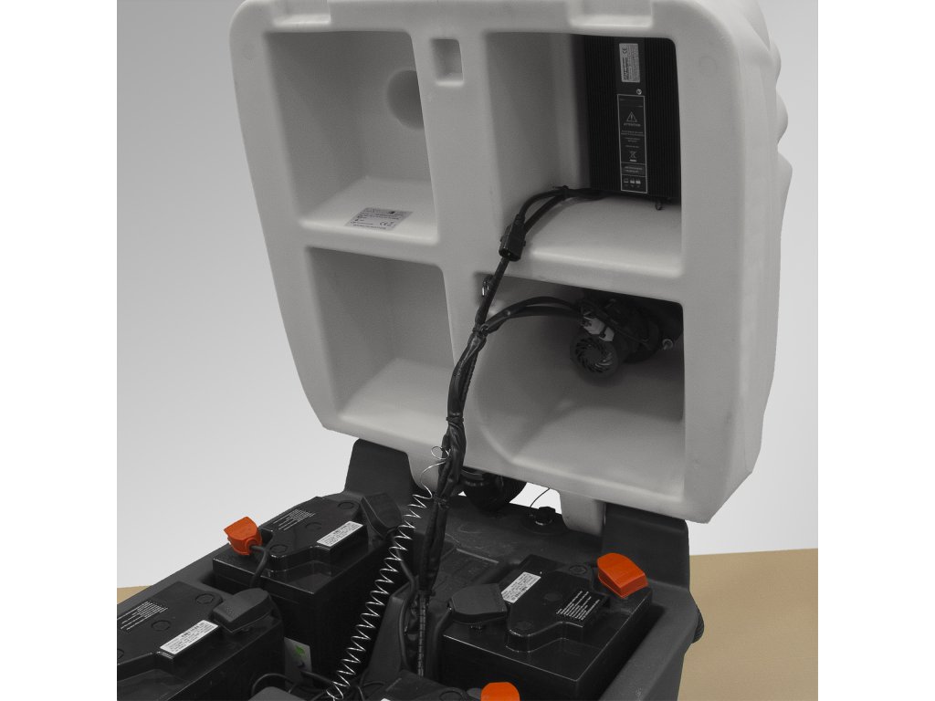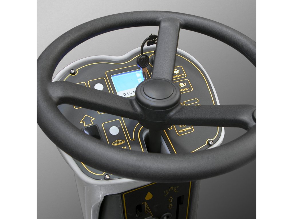 S počítadlom hodín, indikátorom stavu nabitia batérie, indikátorom stavu prázdnej nádržky na vodu, indikátorom trakcie vpred/vzad, nastavením rýchlosti, klaksónom, spínačom sacieho motora s oneskoreným vypnutím, prepínačom zdvíhania/spúšťania kefy, spínačom motora kefy.