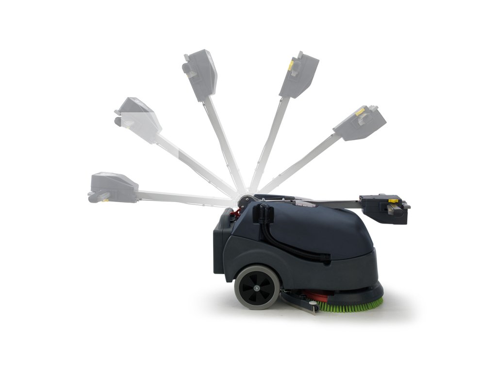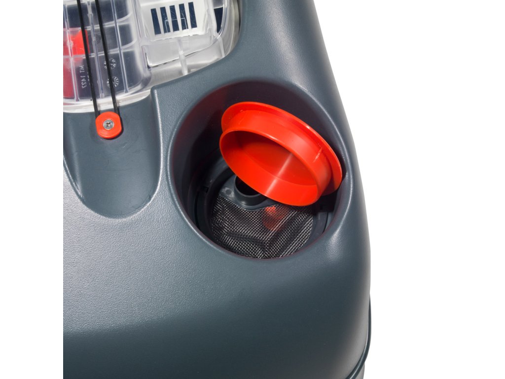 Priehľadný odlučovač umožňuje neustálu kontrolu čistoty vzduchu vstupujúceho do sacieho motora. Gravitačný prívod, ktorý eliminuje potrebu akéhokoľvek čerpadla, zabezpečuje vysokú prevádzkovú dobu. Výškovo nastaviteľná ovládacia rukoväť poskytuje pohodlnú manipuláciu počas prevádzky a zvyšuje manévrovateľnosť v úzkych chodbách.