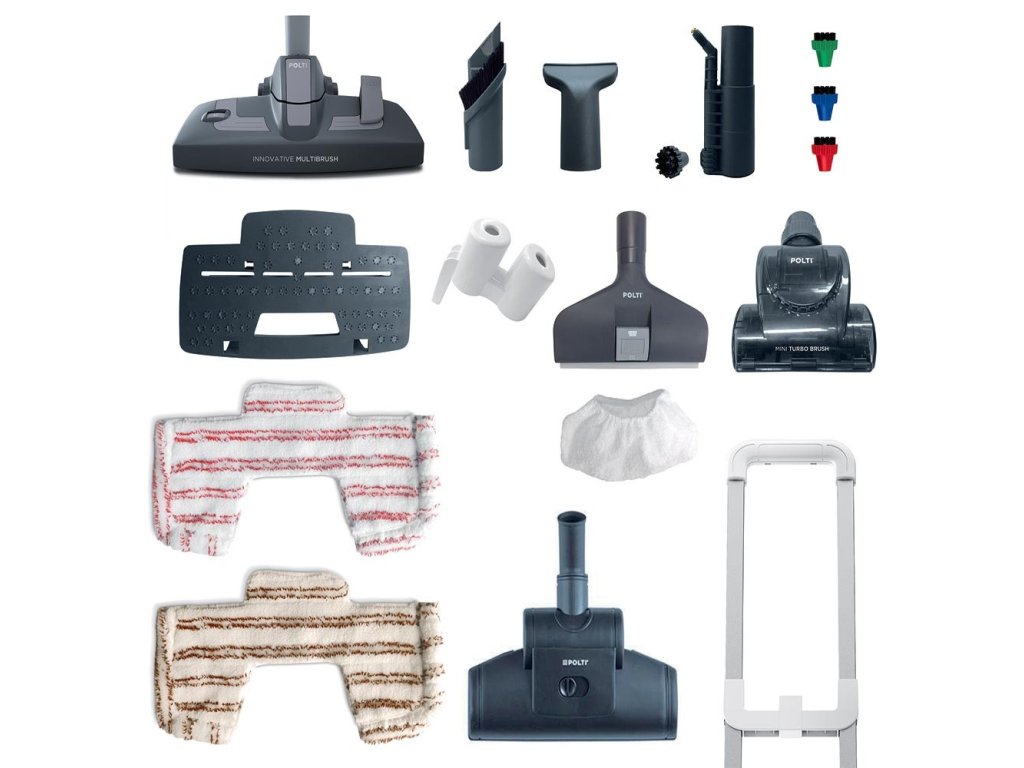 Polti Unico používa praktické príslušenstvo na jednoduché čistenie celej domácnosti: kefu na okná a čalúnenie, kefy na konečnú úpravu plôch ošetrených parou - v 3 farbách na ľahšiu hygienu, nadstavec na vysávanie ťažko prístupných miest a ďalších pomocníkov na zefektívnenie a uľahčenie čistenia vo vašej domácnosti.