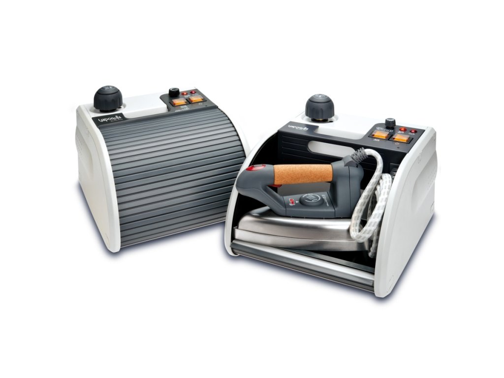 Žehlička s parným generátorom Vaporella Super Pro s exkluzívnym uzamykateľným úložným boxom na žehličku. Naparovacia žehlička s profesionálnou hliníkovou žehliacou plochou ACTIVA .
