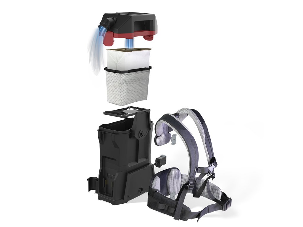 Vysávač má optimálne rozloženú hmotnosť pre pohodlné nosenie aj pri dlhšom používaní. Ergonomicky navrhnutý nosný systém s polstrovanou chrbtovou časťou a individuálne nastaviteľným hrudným popruhom zabezpečuje rovnomerné rozloženie hmotnosti a vysoký komfort pri nosení. Premyslená konštrukcia zároveň umožňuje dostatočné prúdenie vzduchu pri chrbte, čím sa zabraňuje prehriatiu počas nepretržitej prevádzky.